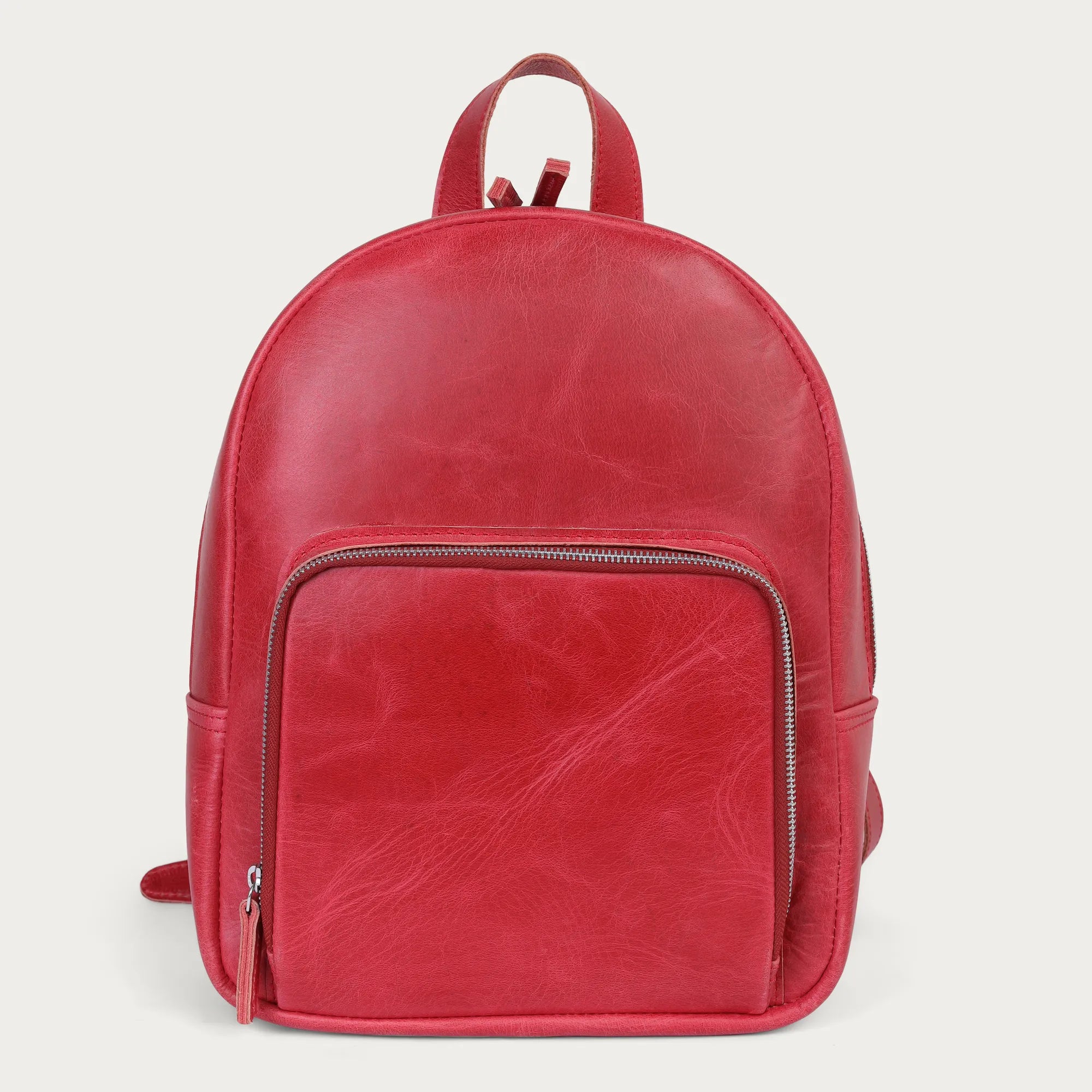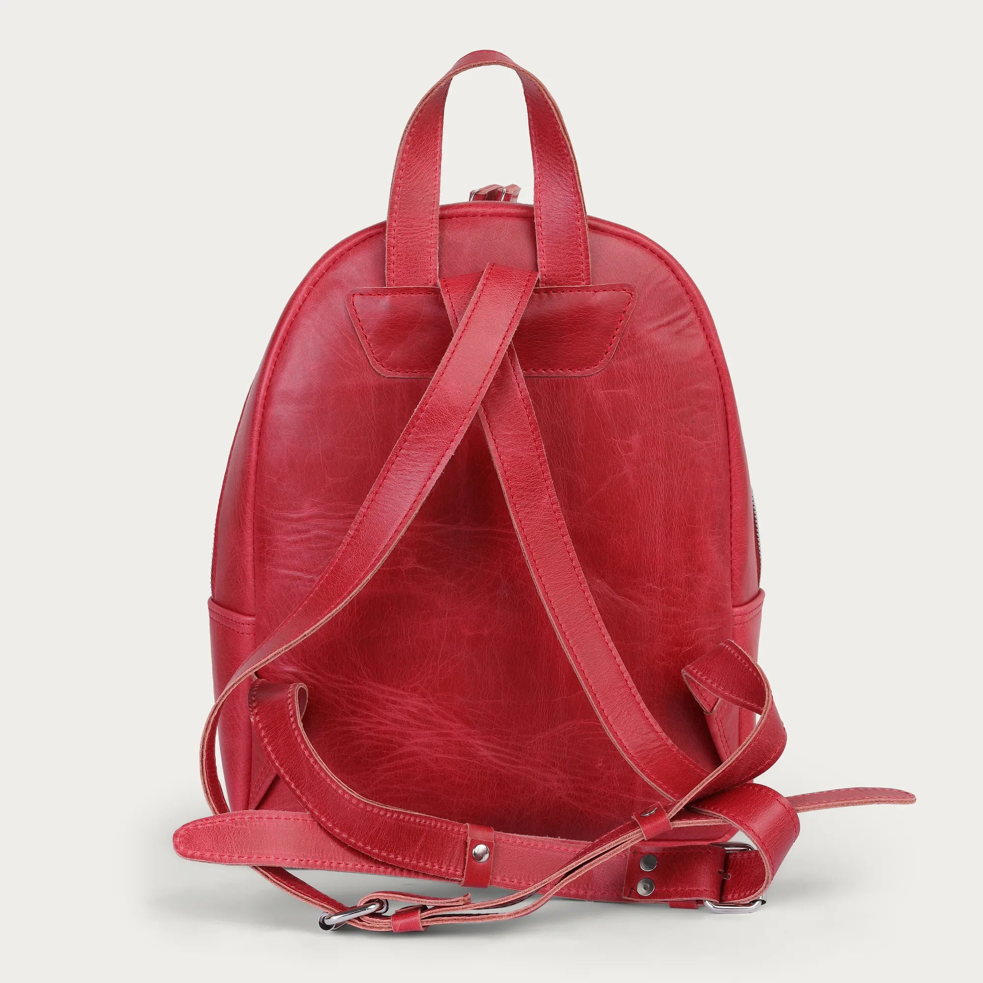A gorgeous scarlet leather backpack that wilfully steals the spotlight. This full-grain cowhide beauty is much more than a mere bag. It is a statement of class. Going to class, working a job, or just about anything else, this minimalist bag will shelter you in style.