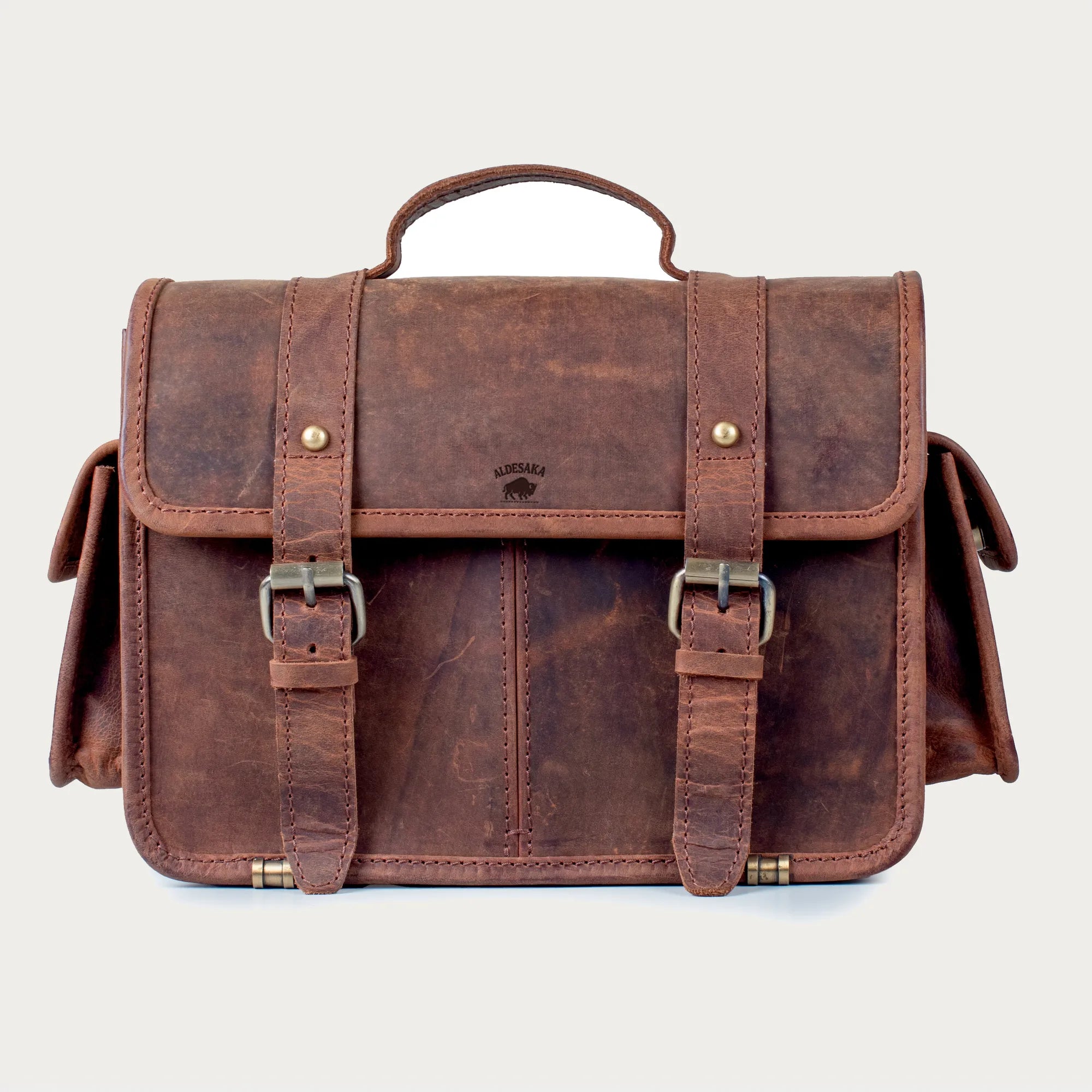 Classic Buffalo Leather Messenger Bag – Handmade Full-Grain Laptop Briefcase with Dual Front Buckle Pockets