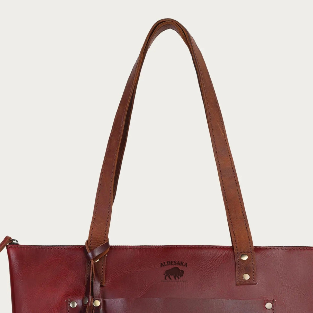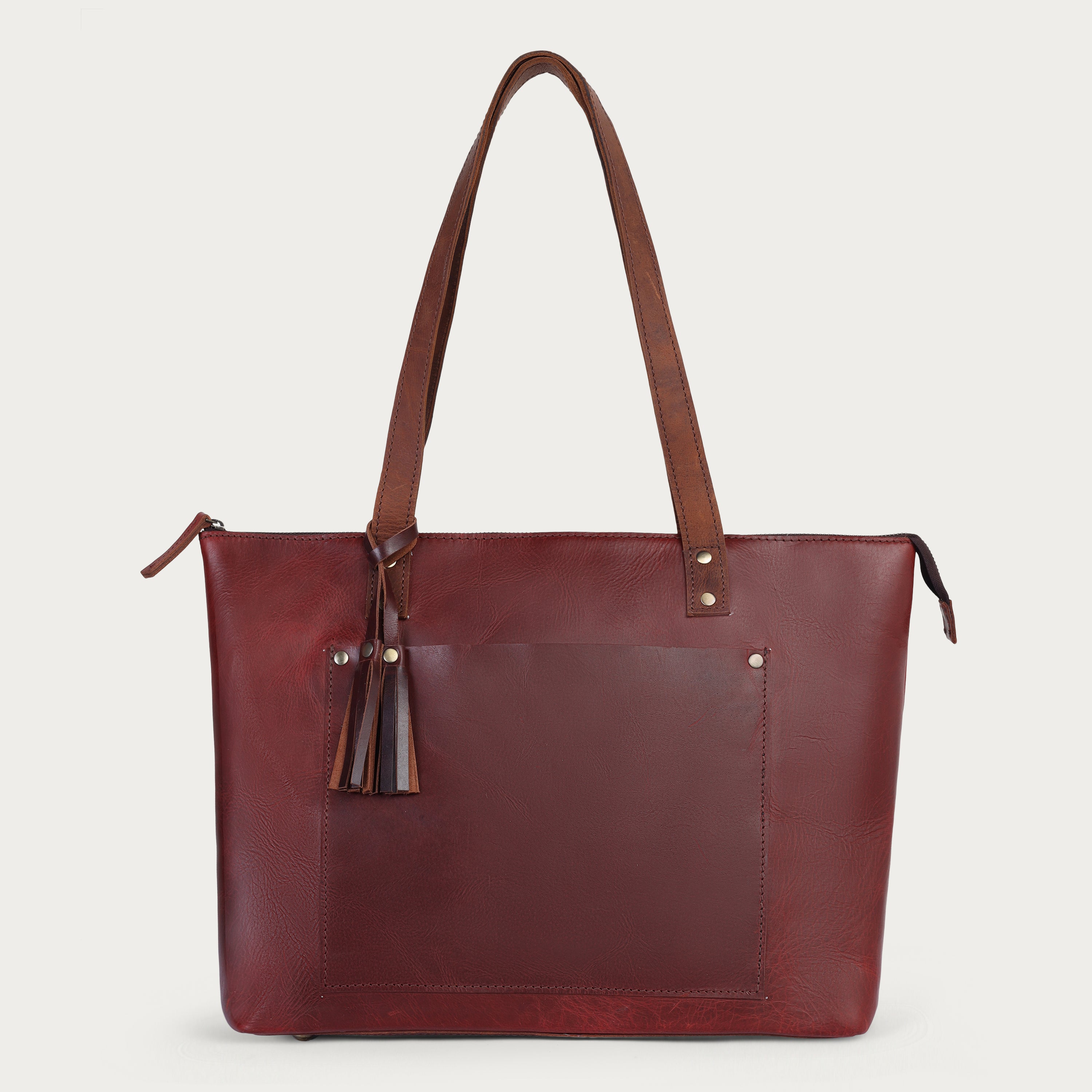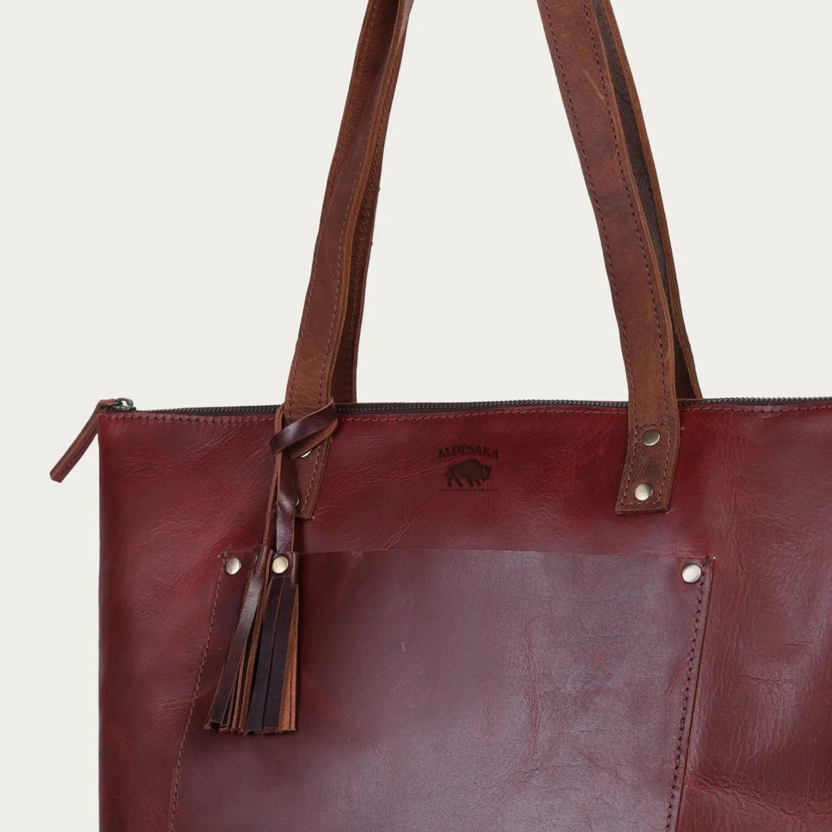 Crafted from full-grain cowhide in a bold wine tone, this tote is naturally textured and built to age beautifully. The leather tassel adds a graceful, signature detail that makes it truly one-of-a-kind.