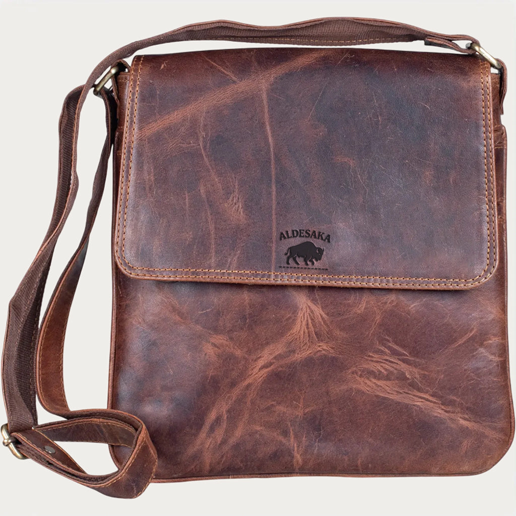 Crafted from distressed full-grain leather with a rich patina and minimal stitched flap design.