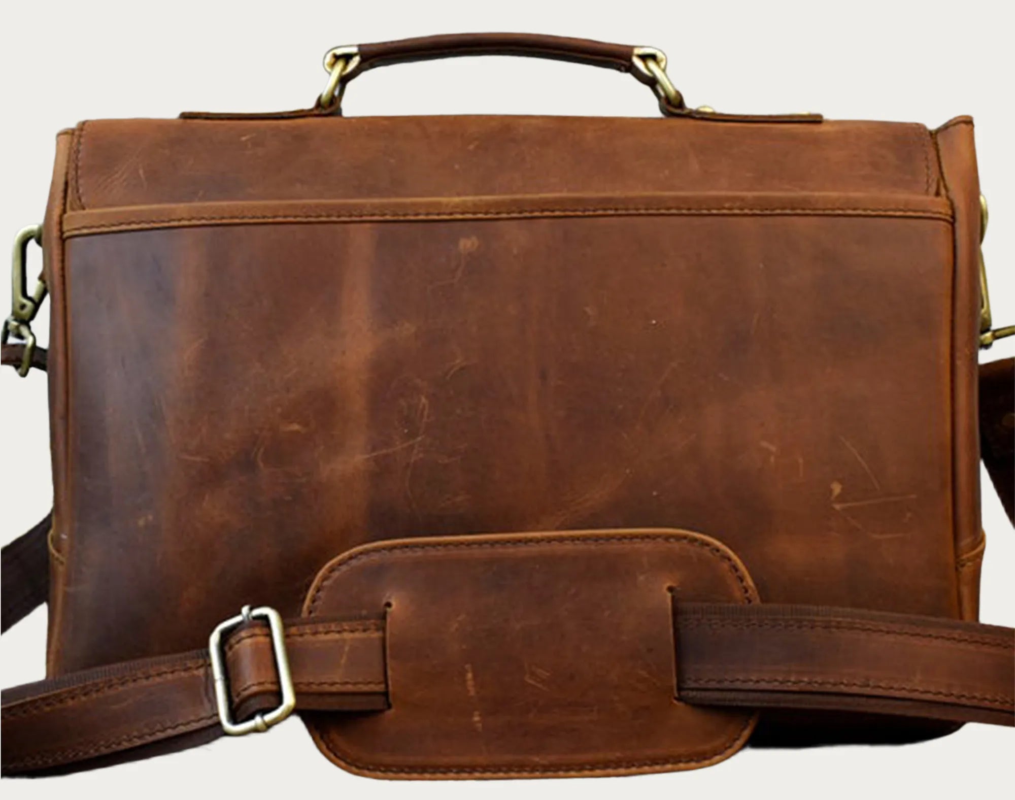 Crafted from rugged full-grain leather with dual front pockets and antique brass hardware for a timeless, rustic appeal.